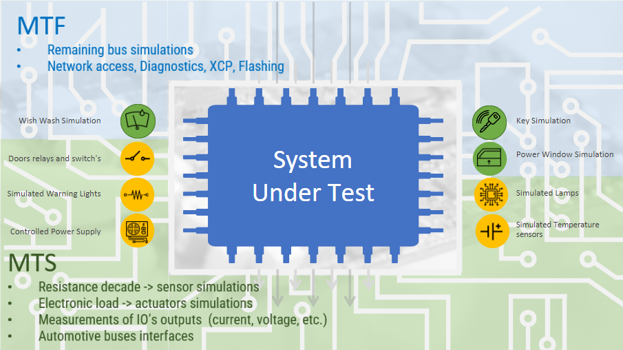 In our architecture MTF is the publisher client offering the following functionalities for the subscribers: - Start and stop frame transmissions - Set and check signals over CAN, LIN and Flexray frames - Set and check Ethernet signals over SOME/IP and NPDU - Set and check hardware I/O signals - Set and check the voltage and current of the power supply - Start, suspend, resume and stop ECU simulations - Control simulations using predefined controllers