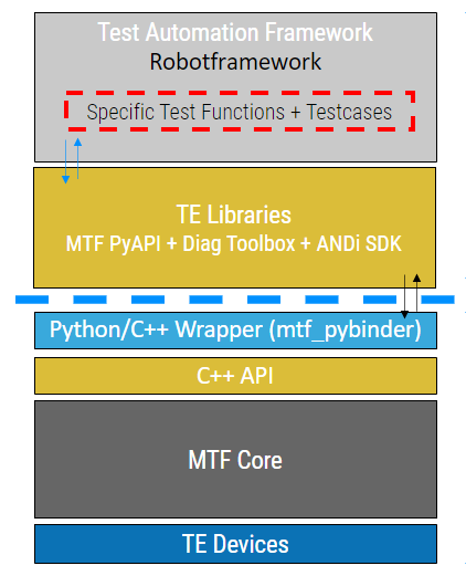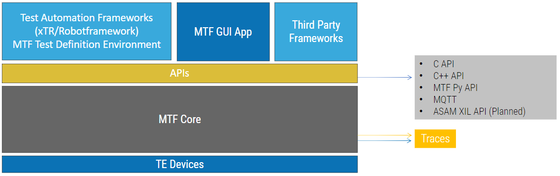 In order to communicate with the mtf.core, its functionalities are exposed to other components, or even directly to any interested user, through APIs. The main API is Python-API. It allows the commuication with mtf.core functions through Pyhton language, enabling users to create test cases (either directly or through one of the Test Automation Frameworks).