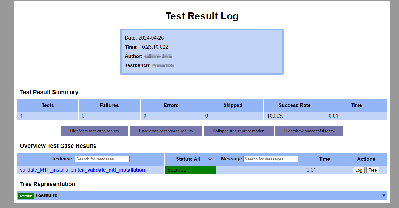 Additionally, the HTML report provides a tree representation of the test suite, which include the test suite, test groups, test cases, test phases and test steps.