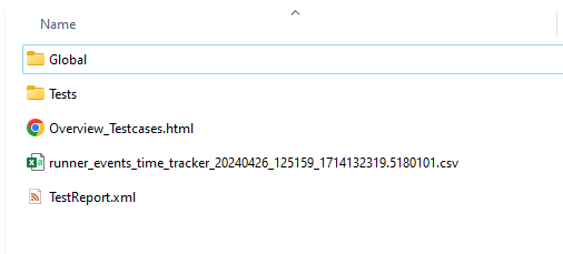 The ‘Results’ folder should contain execution outputs in various formats. It includes general test results files alongside two sub folders: ‘Global’ and ‘Tests’.