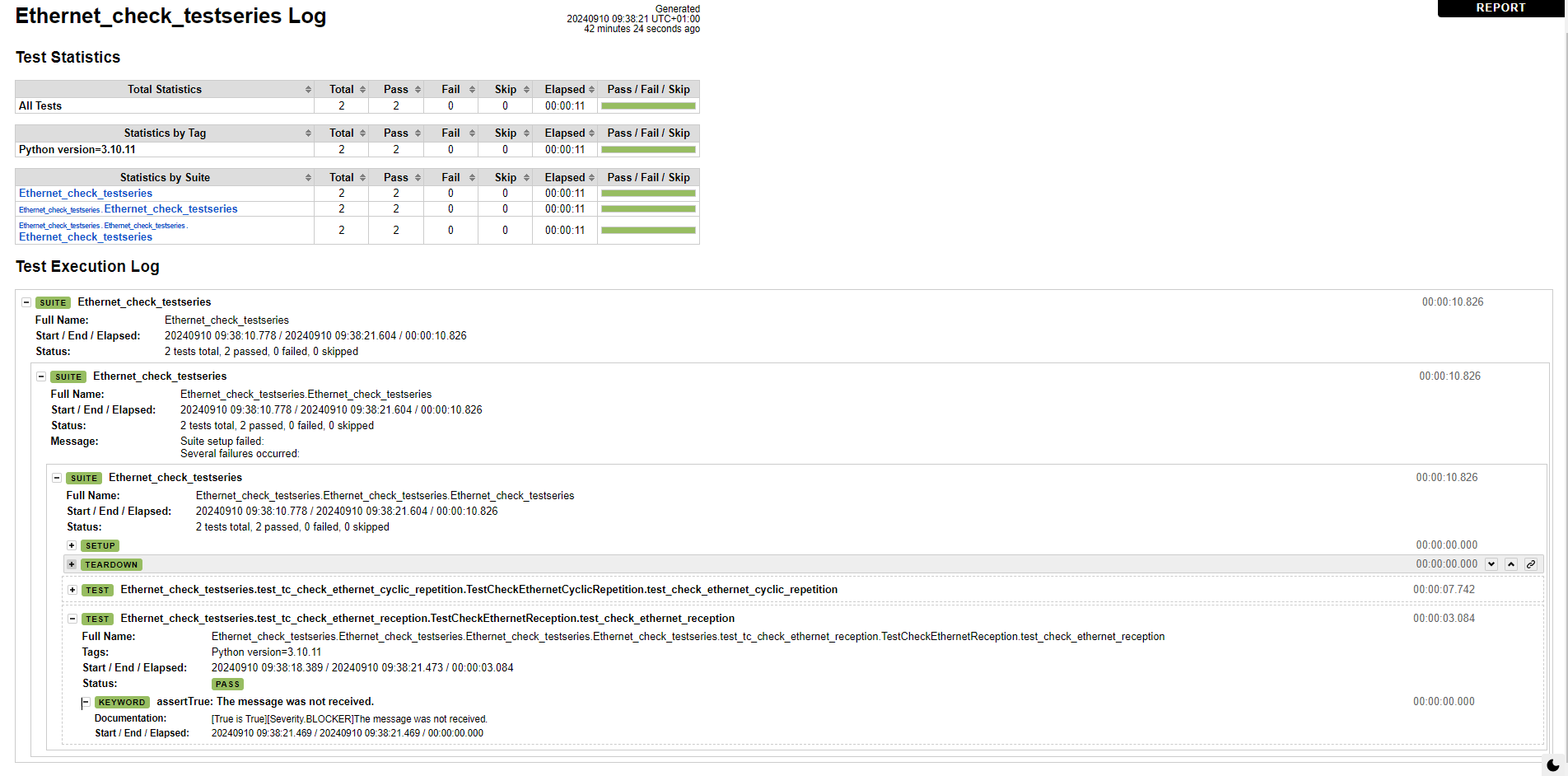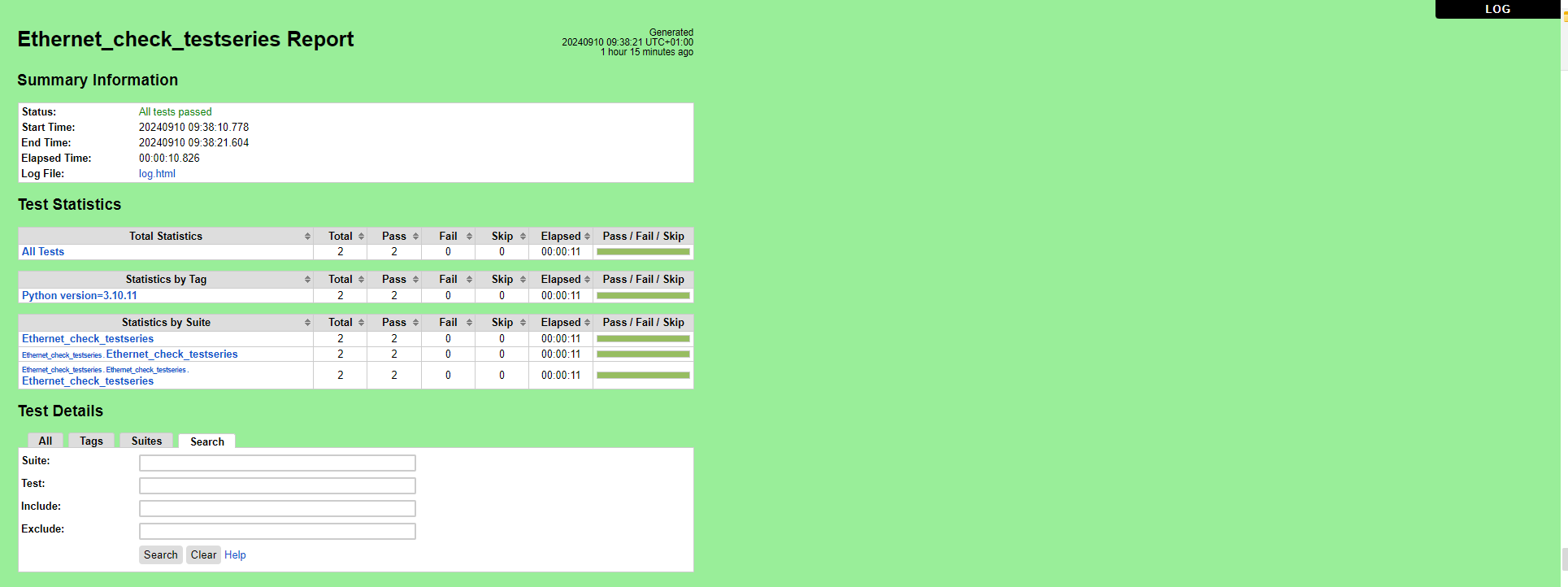 HTML log file: Contains more detailed status information of the executed test cases, including a tree view.
