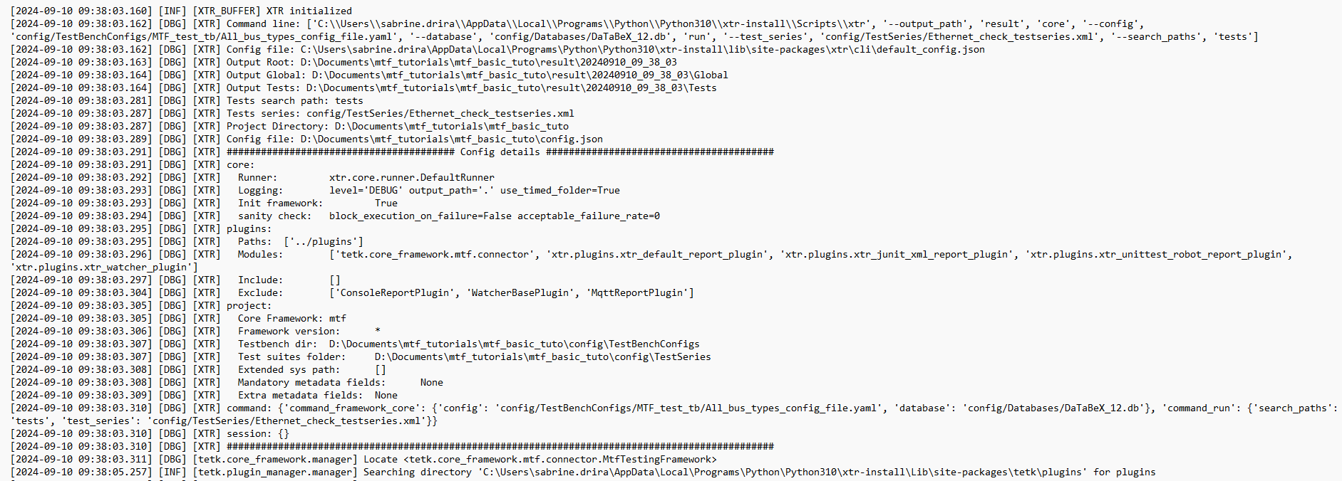 When you execute MTF test cases with XTR, both the test runner and MTF itself generate outputs, including log files and traces. Generally, each test case produces its own log file (named LogName.log) within its specific folder. There is also a global log file for the entire test series. Additionally, trace files may be in one of the following formats: Pcap, PcapNg, or ASCII.