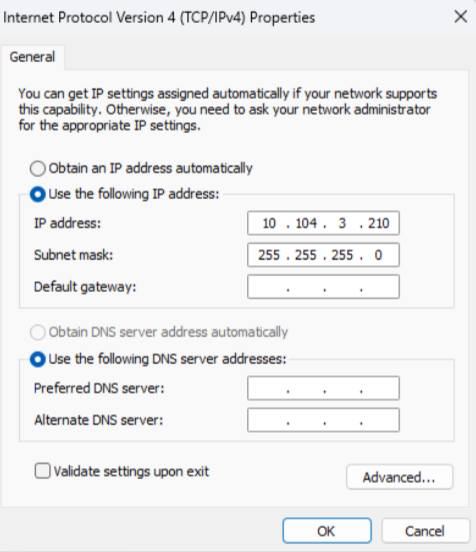 IP address check: As part of the verification, the user needs to check whether the IP address of the Ethernet adapter connected to the Capture module is within the same range as the Capture module’s IP address.