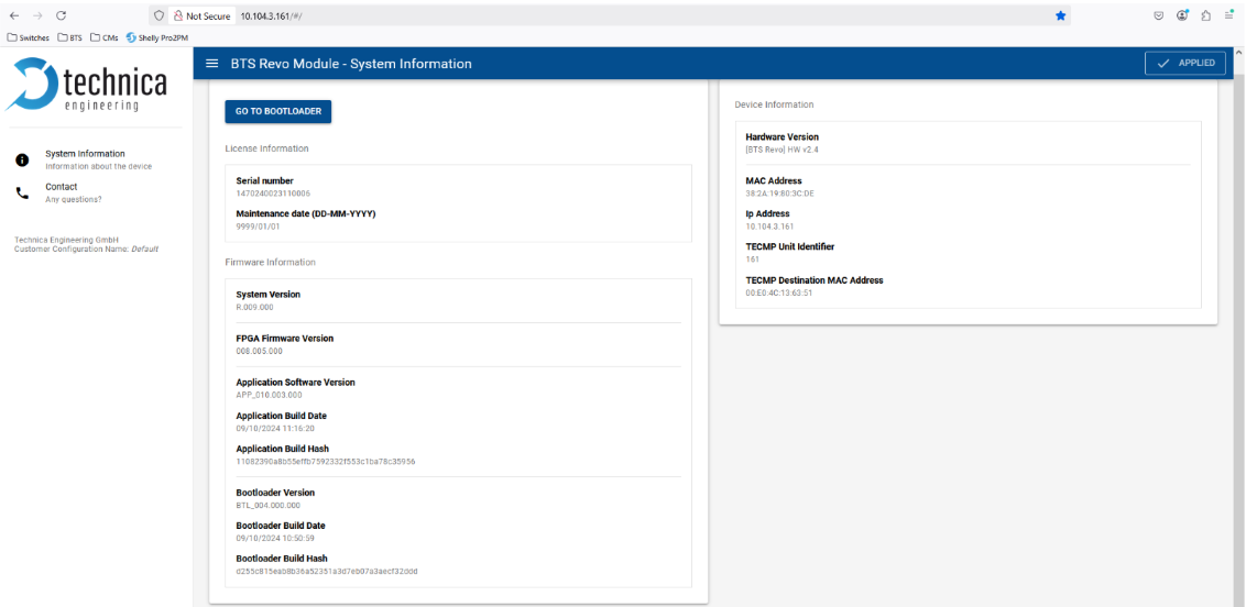 The default IP address of the BTS Revo is 10.104.3.160, where 160 corresponds to the device ID in the YAML file.